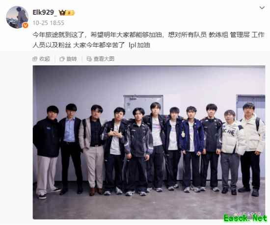 据此前报道,BLG作为LPL一号种子爆冷止步16强后,Elk于10月25日发布战队合照告别赛季。赛后采访中多次道歉:“作为一号种子16强给LPL丢人”,并反思团队从输给100T后“配合特别差”。