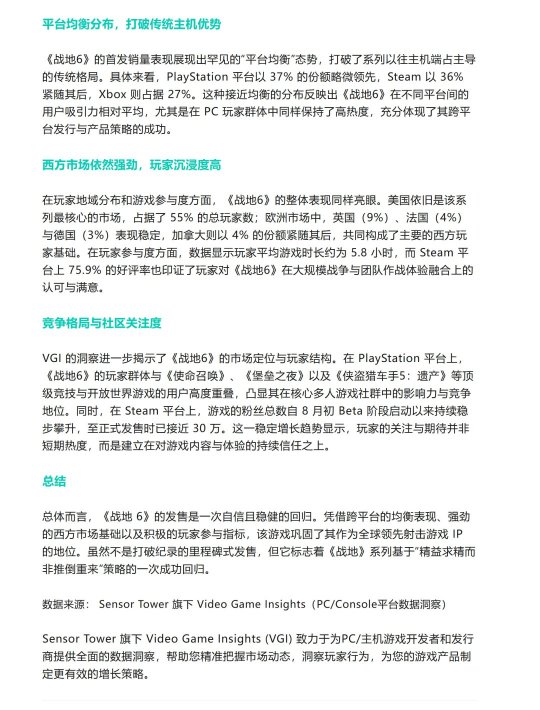 根据Sensor Tower旗下Video Game Insights (VGI) PC/主机平台数据洞察的最新数据,《战地6》首发5天,PC/主机平台总销量大约660万套,“为系列续作的稳步发展奠定了坚实基础”。