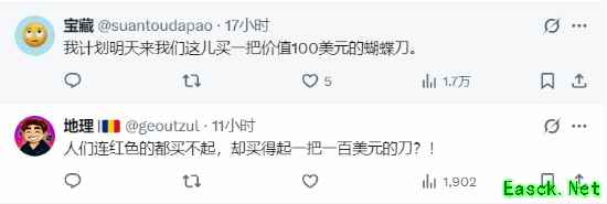 国外社区的许多玩家看到视频后大为震惊,直言这直观地显示了蝴蝶刀价格将大幅下跌,“迫不及待想看到只卖100美元的蝴蝶刀了”。