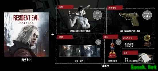 豪华版价格为398元/568港元,除了游戏本体外,还有格蕾丝的“蒂米特雷斯库”等5套服装(有人猜测包含里昂的服装)、“末日”滤镜、2个“浣熊先生”挂件、4种“末日”武器外观、“浣熊市经典”音乐音效、文件“来自1998年的信”等道具。