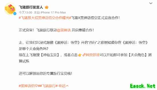 在线旅游平台飞猪旅行今日正式宣布,与国产动作角色扮演游戏《黑神话:悟空》开启重磅跨界合作!