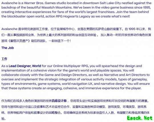 此前招聘公告已透露《霍格沃茨之遗》续作可能成为实时服务游戏的潜质。虽然尚未获得官方确认,但Avalanche持续发布的“多人在线角色扮演游戏”招聘帖中,多次出现与魔法世界直接相关的职位描述,最新招聘信息再次延续了这一特点。
