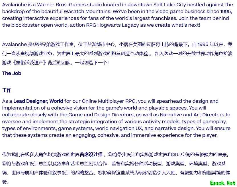 此前招聘公告已透露《霍格沃茨之遗》续作可能成为实时服务游戏的潜质。虽然尚未获得官方确认,但Avalanche持续发布的“多人在线角色扮演游戏”招聘帖中,多次出现与魔法世界直接相关的职位描述,最新招聘信息再次延续了这一特点。