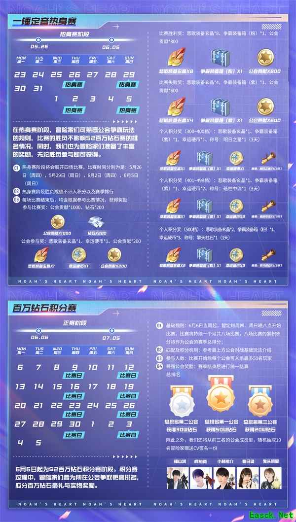 公会赛的第一赛季将分为热身赛和钻石积分赛两个阶段举行,5月26日到6月5日为热身赛阶段,6月6日到7月5日为钻石积分赛阶段。根据公会赛进行阶段的不同,奖励也有变化。