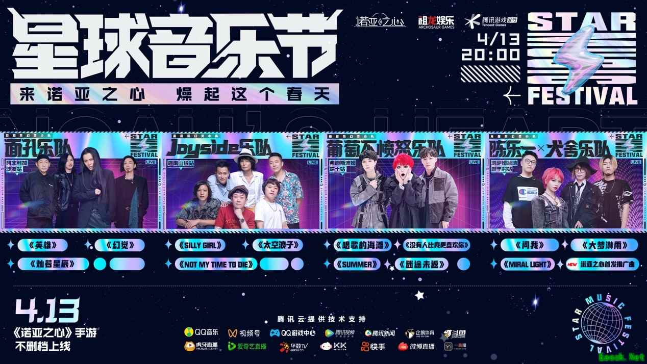 这场星球音乐节将以全网多平台直播的形式展开,参与直播的平台有:QQ音乐、视频号、QQ小世界、腾讯视频、腾讯新闻、企鹅体育、斗鱼直播、虎牙直播、爱奇艺、华数TV、KK直播、快手直播、微博直播、一直播。