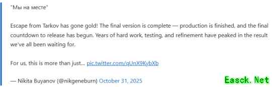 Battlestate Games工作室老大,Nikita Buyanov于10月31日发X宣布,《逃离塔科夫》终于正式开发完毕,已经进入正式发售的倒计时,预定11月15日登录Steam,敬请期待。