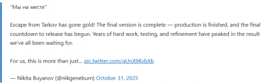 Battlestate Games工作室老大,Nikita Buyanov于10月31日发X宣布,《逃离塔科夫》终于正式开发完毕,已经进入正式发售的倒计时,预定11月15日登录Steam,敬请期待。