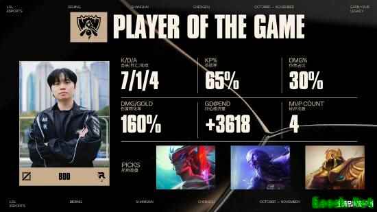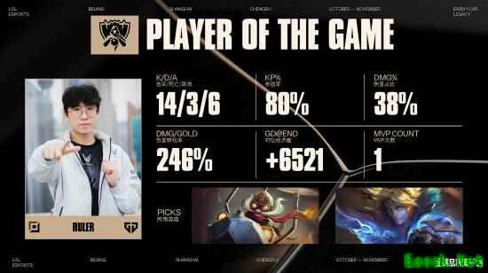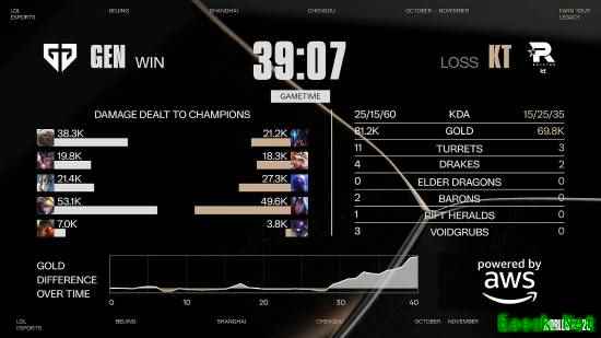38分钟,GEN进攻KT高地,Ruler伊泽瑞尔打出爆炸伤害,GEN击败KT四人并推平基地拿下胜利。