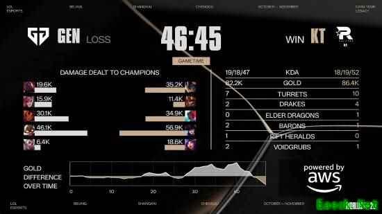46分钟,KT带着大龙BUFF进攻GEN高地,Peter妮蔻大招命中三人,KT击败GEN两人并顺势推平基地拿下胜利。