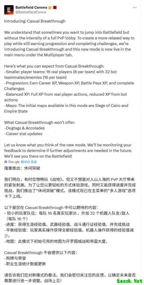 最初,只有“开罗围城”和“帝国之州”被添加到地图轮换中,但EA DICE强调,他们将监控反馈以“确定未来是否需要进一步调整”。