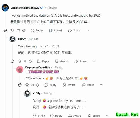 玩家们甚至在评论区更正到,图片日期的不准确性,《GTA6》是2026年推出,也就是说《GTA7》要等到2052年了。