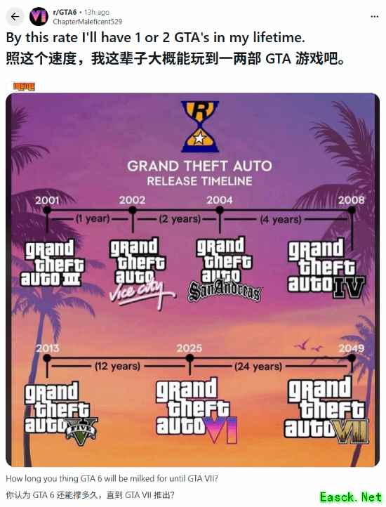 在Reddit论坛,有玩家发文表示,随着R星开发GTA系列游戏的时间越来越长——人这一辈子还能玩到几部GTA游戏呢?