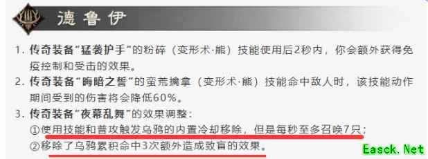 本次体验优化做了一些职业平衡的调整,唯一一个传奇精华做了调整、降低效果的就是德鲁伊的“夜幕乱舞”。