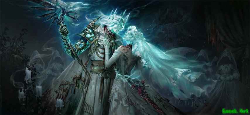女角色头戴花环与朦胧头纱,男的头戴皇冠,圣洁的白与凄艳的玫瑰红,这二者结合在一起,在满是亡灵的背景衬托下,营造了一种连死亡都无法阻隔的永恒之爱。