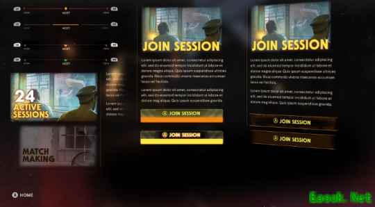 虽然这些图片主要展示的是用户界面设计,但我们也能从中窥见一丝游戏内场景。尽管它只是某个菜单的模糊背景,但从中可以辨认出,这似乎是一个光线昏暗的安全屋,里面堆放着板条箱和盒子。考虑到它出现在招募菜单的后面,这强烈暗示着该地点可能曾是玩家的主要枢纽或兴趣点。