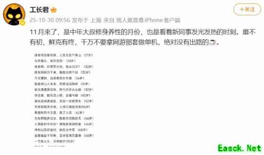 工长君说:“11月来了,是中年大叔修身养性的月份,也是看着新同事发光发热的时刻。靡不有初,鲜克有终,千万不要拿网游那套做单机,绝对没有出路的。”