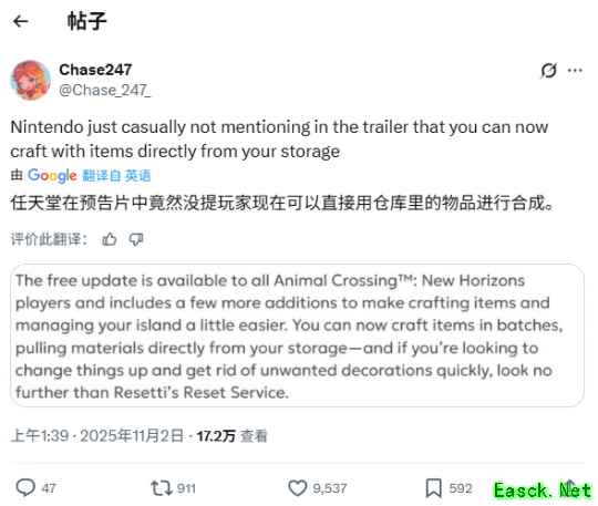 任天堂在Switch 2版本升级包的商店页面中说明:“此免费更新面向所有《集合啦!动物森友会》玩家,新增了一些功能以便更轻松地制作道具和管理岛屿。你现在可以批量制作道具,直接从仓库提取材料。”