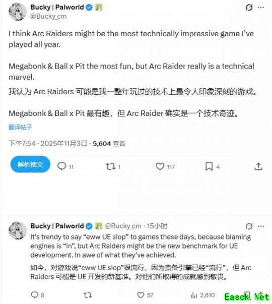 “如今流行说‘啧,又是款糟糕的虚幻引擎游戏’,甩锅引擎已成时尚。但《ARC Raiders》可能会成为虚幻引擎开发的新标杆。他们的成就确实令我震撼。”