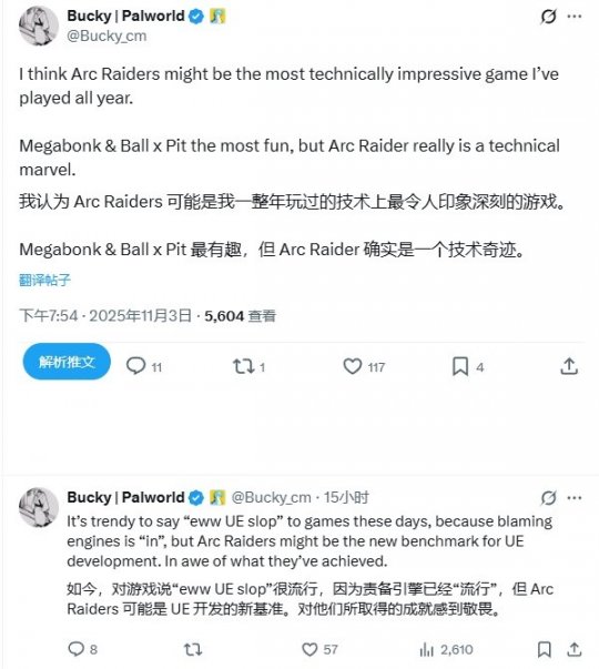 “如今流行说‘啧,又是款糟糕的虚幻引擎游戏’,甩锅引擎已成时尚。但《ARC Raiders》可能会成为虚幻引擎开发的新标杆。他们的成就确实令我震撼。”