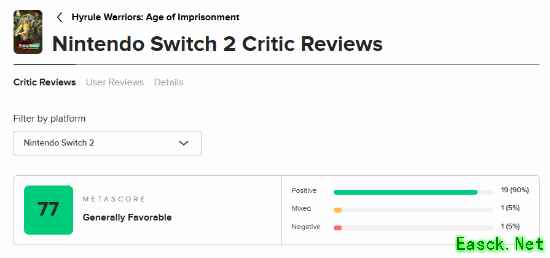 《塞尔达无双 封印战记》口碑已解禁,M站媒体均分77分。其中19家媒体给出好评,1家给出中评,1家给出差评。