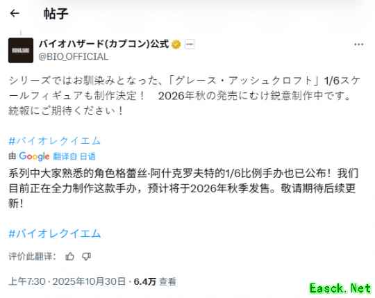 据《生化危机》日本官方账号透露,格蕾丝·阿什克罗夫特的1:6比例实体雕像正在开发中,预计于2026年秋季推出。这一安排被部分业内人士视为卡普空可能采用分阶段发售策略,先推出基础典藏版,后续再发布高端版本。