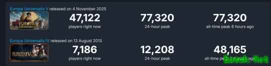 SteamDB显示,《欧陆风云5》同时在线峰值达到了77320人,大大超越了前作《欧陆风云4》,后者Steam在线峰值为48165人。