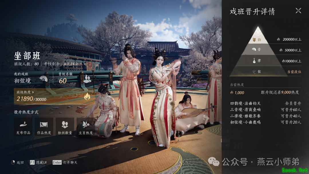 梨园中设有【戏班】全新制度,在梨园中的地位排名除非有常规的功绩排名外还有弟子汇集的戏班热度榜!以此来让戏班等级提升!当戏班等级越高,则晋升比例越高,降级比例越低