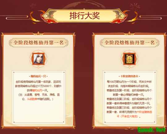 若全服熔炼仙丹总量达到第三阶段(300万颗),全阶段熔炼数量第一的玩家将直接获得十阶坐骑自选卡(不含玄火烛龙)。全阶段使用熔炼仙丹第一名玩家,且该玩家熔炼超17.5万颗仙丹,还可额外解锁随机仙元(从逐鹿、苍穹、无名、净瓶、昆仑、斗战胜佛中随机选取。)