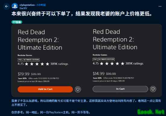 据他分享的截图显示,他的账号购买《荒野大镖客2:终极版》可享80%折扣,而他妻子的账号则高达85%。这位玩家调侃道:“我本来高高兴兴准备下单,结果发现我老婆账号买居然更便宜……可她平时几乎不玩游戏,用她账号买还得来回切换,属实有点麻烦了。最终购买热情大打折扣。”