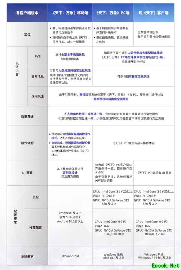根据网易游戏官方介绍,万象版的移动端、PC 端可提供如今在现行客户端中体验到的内容。相比于当下的客户端,万象移动端更便捷;万象 PC 端则在提供完备的服务以外,在画质、战斗体验等多个方面能提供更优质的体验。