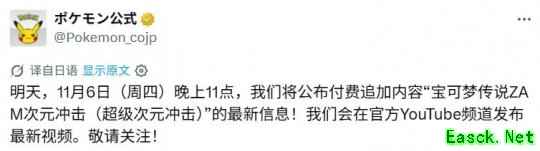 官方在社交媒体上表示:“将于11月6日晚上11点(北京时间晚上10点,我们将公布《宝可梦传说:Z-A》付费新增内容“超次元爆涌”的最新情报!最新宣传片将在官方油管频道同步公开!”