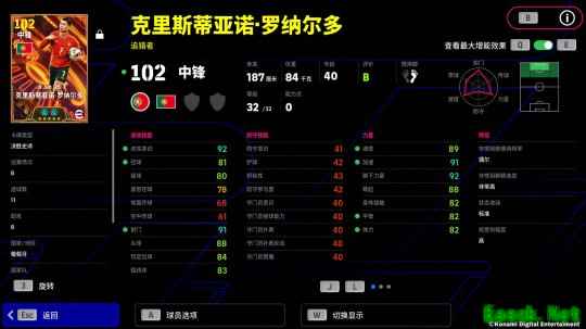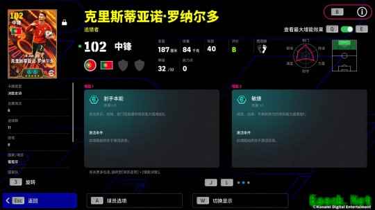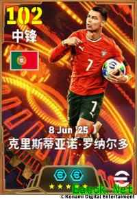 C罗拥有【射手本能 +3】的增能属性,射门和控球的增强让C罗在前场更加全能!不仅如此,C罗还自带【炮弹式头球】的特殊技能,搭配88分的头球和88分的跳起,C罗在实况赛场也能成为“头球之王”!