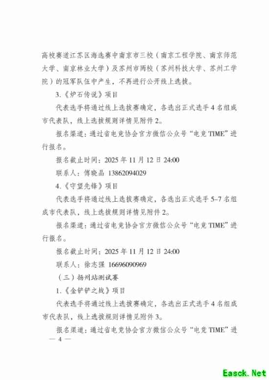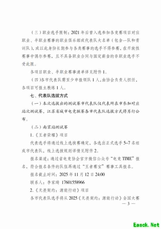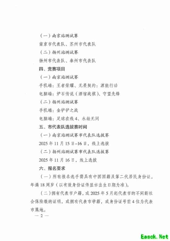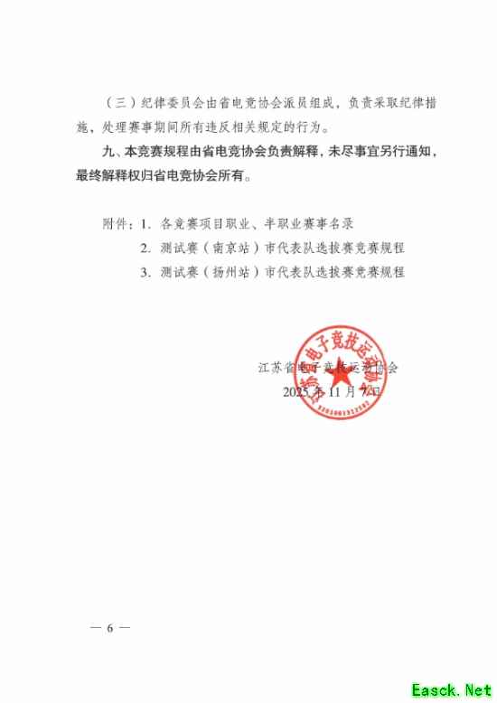 江苏省城市电竞联赛官方发布了关于印发2025江苏省城市电竞联赛测试赛(南京站、扬州站)市代表队选拔赛竞赛规程的通知。