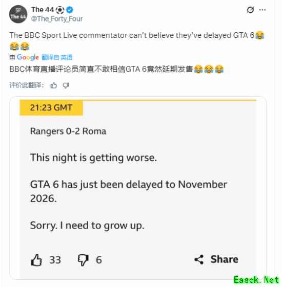 至于网友?那当然是“梗图时间”。甚至连BBC体育频道的记者在实况报道昨晚欧联足球赛(罗马vs格拉斯哥流浪者)时,顺手插入一句“《GTA6》又延期”的新闻:“这夜晚真是糟透了。《GTA6》刚宣布延期到2026年11月。”
