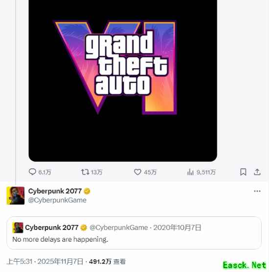 互联网上粉丝们更是一片哀嚎,海外社区还诞生了很多梗图。先来看《赛博朋克2077》开发商CD Projekt的反应。他们借机调侃自己当年也曾信誓旦旦地表示不会再延期,结果却在2020年12月才推出游戏。