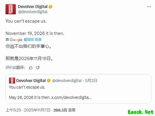 另一方面,《迈阿密热线》发行商Devolver Digital则延续了他们一贯的玩梗风格——再次“威胁”要在《GTA6》发售同日推出自家游戏。如今他们把神秘新作也改档到了2026年11月19日。