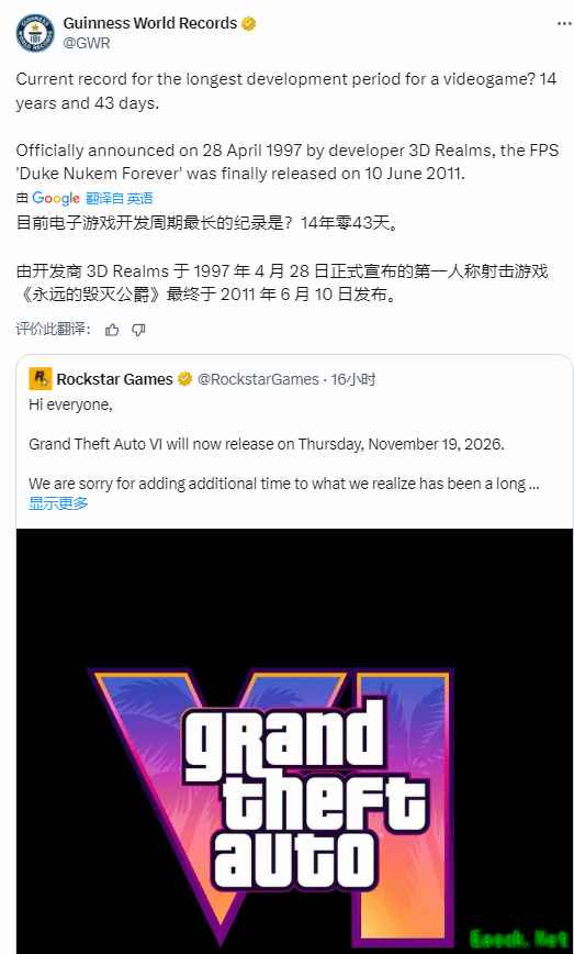 而吉尼斯世界纪录官方账号也来凑热闹,官号科普了目前电子游戏开发周期最长的纪录是“14年零43天”,由3D Realms制作的《Duke Nukem Forever》保持。