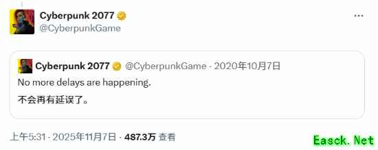 深谙“跳票之痛”的《赛博朋克2077》官方账号,则选择了一个“高端嘲讽”:他们仅仅转发了一条自己2020年的旧推文,内容是: