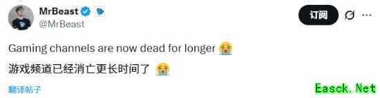 全球最受欢迎的YouTuber MrBeast迅速在X上发表了评论,表达了他对游戏内容创作者的担忧:“游戏频道要再死更久了 ????”