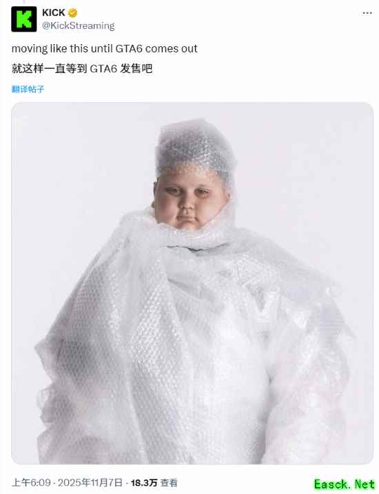 流媒体平台KICK也加入了战局,他们发布了一张小孩全身包裹着气泡膜的图片,配文写道: