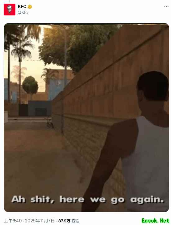 KFC的官方账号祭出了一个经典的游戏梗:他们贴出了一张 《GTA:圣安地列斯》 开场动画的静止画面。