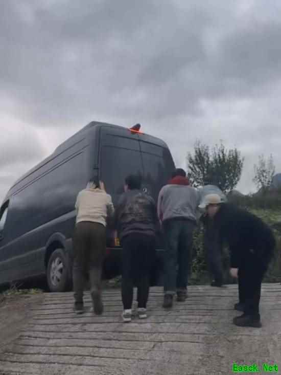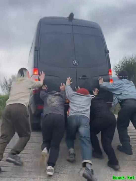 杨奇晒出的视频显示,五名同行者合力推车,最终将车辆从下坡推上坡道。从视频来看,车辆疑似为奔驰高端商务车斯宾特。