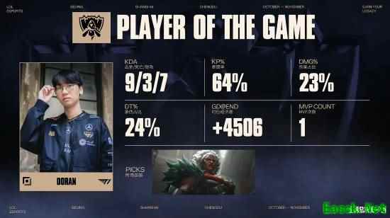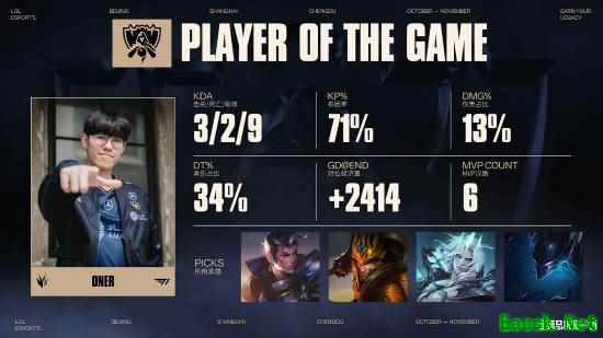 35分钟,双方围绕大龙进行拉扯,Oner潘森和Gumayusi厄运小姐伤害拉满,T1一换五并推平基地赢下比赛。
