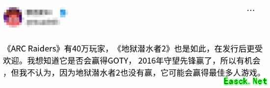 上一次多人游戏获得年度最佳游戏奖是2016年的《守望先锋》,一些玩家认为《弧光突袭者》应该是下一个取得这一里程碑式成就的游戏。