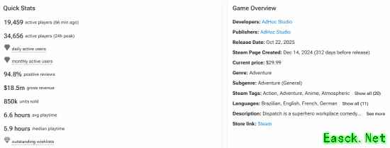 据Sensor Tower预测,近期爆火的《超英派遣中心》Steam销量已达85万份,在线峰值突破13万人。