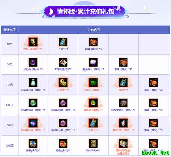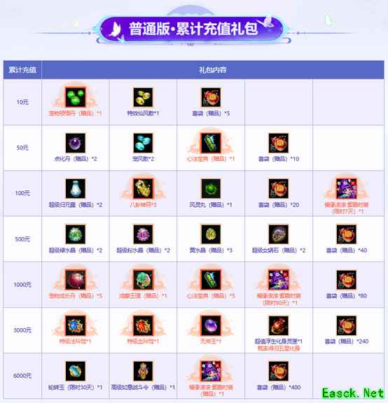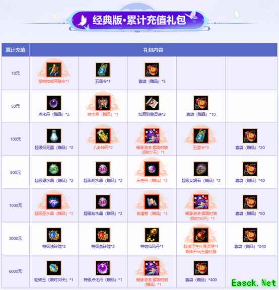 活动期间,普通版和经典版玩家累计充值至10元、50元、100元、500元、1000元、3000元、6000元即可获得对应的丰厚礼包奖励;情怀版玩家累计充值达到10元、50元、100元、500元、1000元、3000元也可获得累计充值礼包。