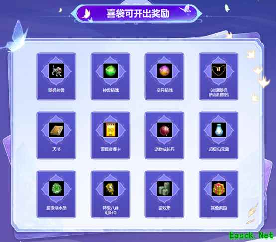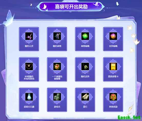 喜袋内含丰富奖励,普通版的道友有机会开出随机元灵(元灵从赤天、混沌、笛舞、降魔、夫诸、震魃中随机开出)、随机神兽、变异、神兽精魄、变异精魄、满属性装备箱、80级随机所有相首饰、道具套餐卡、商城道具、道行、游戏币等。