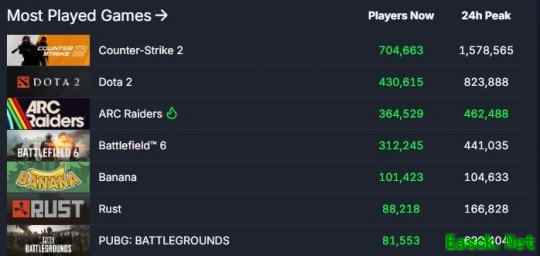 根据SteamDB数据显示,《ARC Raiders》活跃玩家数已突破46万,稳居Steam热门游戏榜第三位,仅次于《CS2》与《Dota2》。相比之下,《战地6》则以约44万玩家数暂居第四,且大量《战地6》玩家正持续流向《ARC Raiders》。需要注意的是此数据仅反映Steam平台情况,鉴于两款游戏均登陆PS5与Xbox Series X/S平台,《战地6》仍有可能在其他平台保持领先。