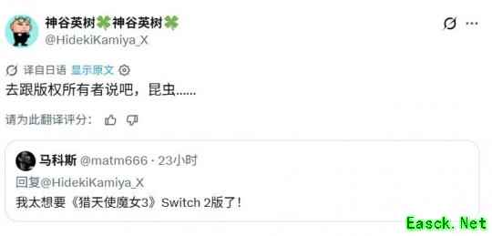 事件起因是某粉丝在神谷的推文下表达了期待"《猎天使魔女3》Switch2版本"的愿望。这位以坦率犀利著称的游戏制作人随即引导对话指向掌握系列版权的相关方。此前他刚回应过一位展示《猎天使魔女》三部曲的支持者,简短致谢道:"承蒙惠顾。"