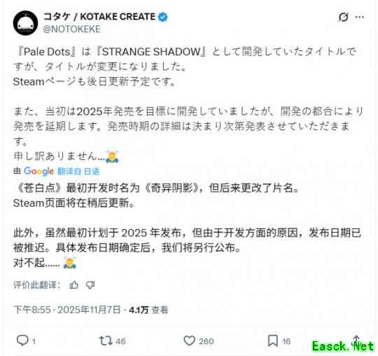 《8号出口》开发商KOTAKE CREATE官推宣布目前正在开发的新作,名称从“ STRANGE SHADOW(奇异阴影) ”更改为“ Pale Dots(苍白点) ” ,Steam页面稍后更新,并宣布延期发售的消息。